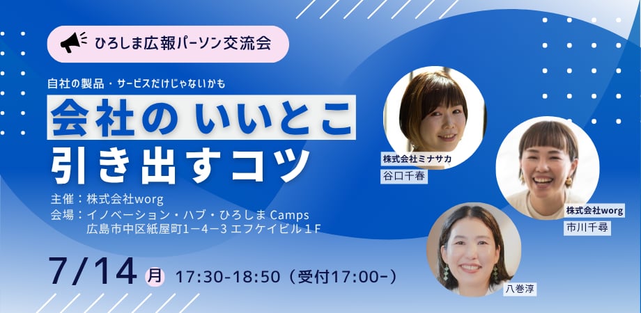 何を誰にどう伝えるか、これまで数多くの会社に合わせて広報スタイルをオーダーメイドしてきたworgの市川千尋さんと、ひろしまゲートパーク内にある展示「Pride of Hiroshima」等で、心を動かす広島の会社の「物語」を引き出してきた谷口千春さんを迎え、「え?うちの会社のいいとこって何だろう?」と答えに行き詰まる広報パーソンにヒントをお届けします。