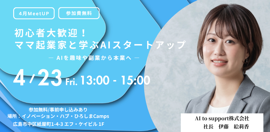 本イベントでは、実際に広島を拠点にAI研修・コンサルティング事業を立ち上げた経験をもとに、起業の具体的なプロセスや、AIを日常業務にどう取り入れているかをリアルにお伝えします。